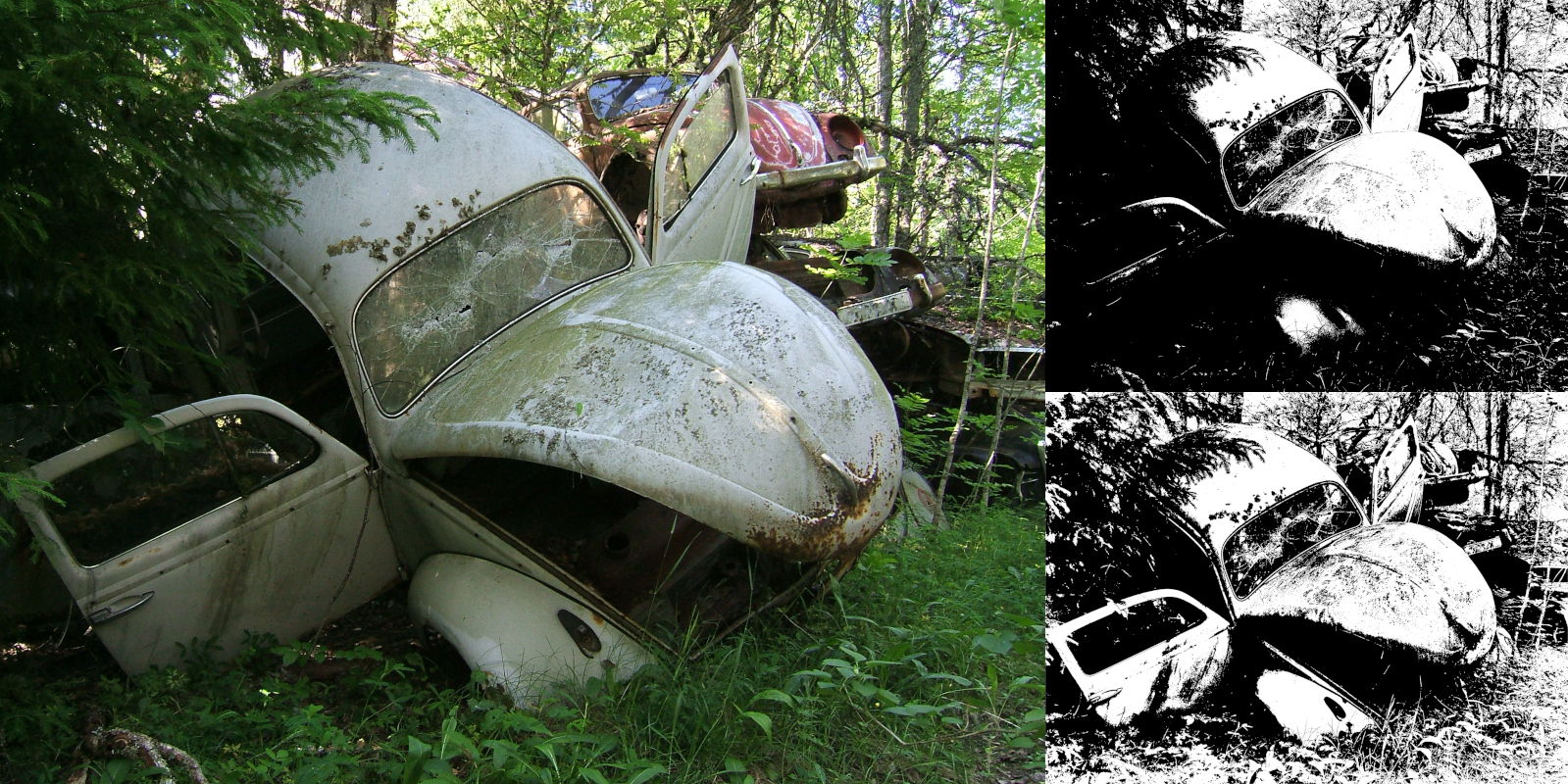 Left: original; top-right: result with current Threshold filter; bottom-right: result with new Local Threshold - GIMP 2.99.16